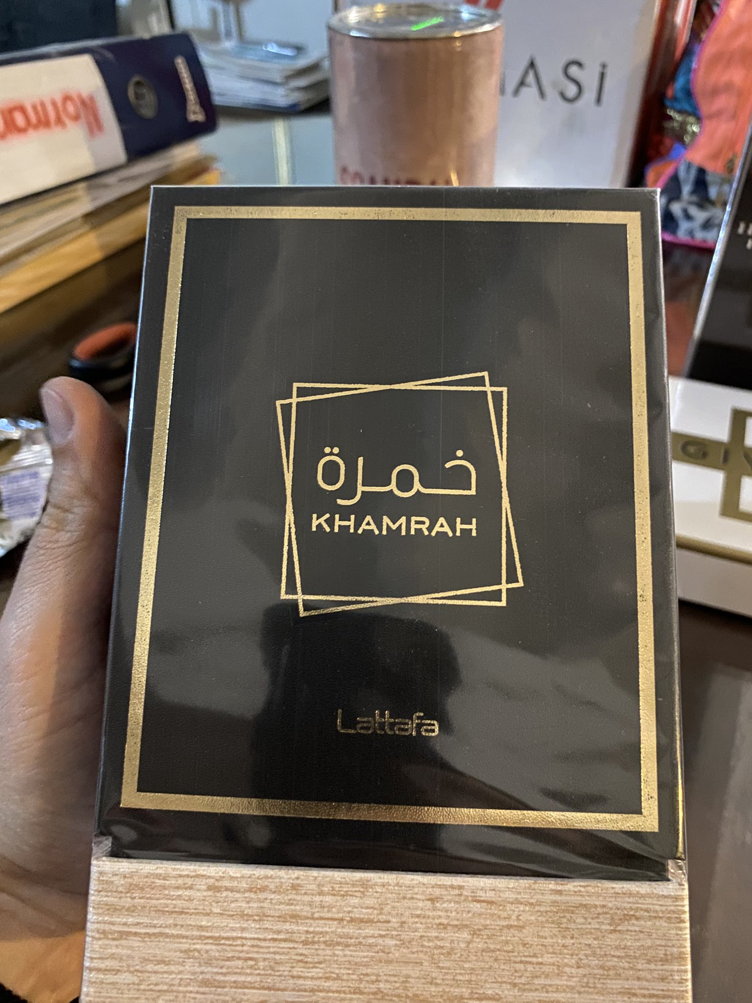 Khamrah by Lattafa Perfumes is a Oriental Spicy fragrance for women and men. This is a new fragrance. Khamrahwas launched in 2022. Top notes are Cinnamon, Nutmeg and Bergamot; middle notes are Dates, Praline, Tuberose and Mahonial; base notes are Vanilla, Tonka Bean, Amberwood, Myrrh, Benzoin and Akigalawood.